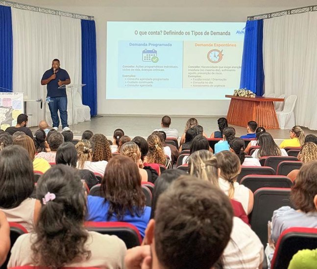 Oficina da Atenção Primária à Saúde (APS), encontro que reuniu profissionais das unidades básicas: médicos, enfermeiros, técnicos de enfermagem, odontólogos, psicólogos, fisioterapeutas, educadores físicos, assistentes sociais, agentes comunitários de saúde e demais profissionais da rede municipal, promovendo troca de experiências e apresentação de projetos desenvolvidos para melhor atender a população.